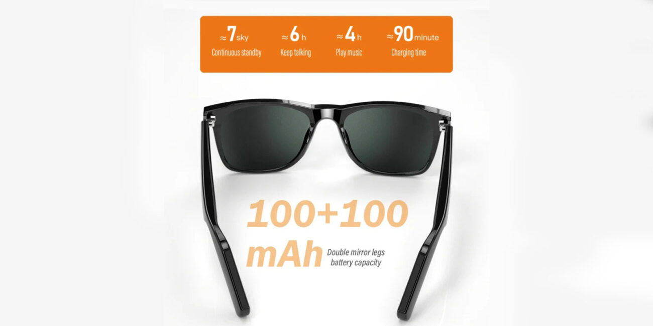 عینک هوشمند مدل E10 با یک بار شارژ کامل تا 6 ساعت عمر باتری دارد، که برای استفاده روزانه کافی است. زمان شارژ کامل عینک نیز حدود 90 دقیقه است.